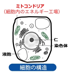| ■ | ミトコンドリアは、細胞中のエネルギーを作り出す重要な器官です。しかし、ミトコンドリアが老化すると、活性酸素という有害物質を多く出し、細胞組織を破壊することによって、 脱毛・白髪・シミ・シワ・物忘れ・認知症・血管の老化などの原因となります。 |
